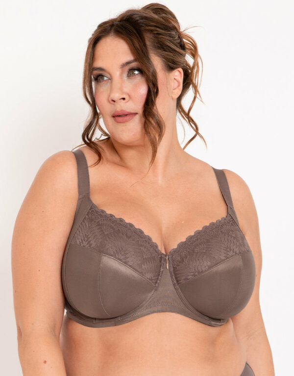 Adella’s Athena full cup bra is created specifically for fuller figure comfort and support in premium fabrics that showcase beautiful lace detail, and now available in a rich taupe brown. The full cup shape with 4-part structure has side support panels to give a forward shape and streamlined silhouette, in a luxurious simplex fabric that’s non-stretch to give perfect uplift with an opaque finish and beautiful lace top cup detailing. Wide, non-slip straps and a powermesh band ensure a secure, all day fit with total comfort. Wear with the coordinating Kin full brief for the perfect everyday style. Fuller cup shape for a secure, comfortable fit Non-padded Underwired Fully adjustable straps Fastens with 3 hooks, 3 columns Main: 100% Polyester, Lace: 88% Polyamide, 12% Elastane, Lining: 100% Polyamide, Wing Mesh: 88% Polyamide, 12% Elastane