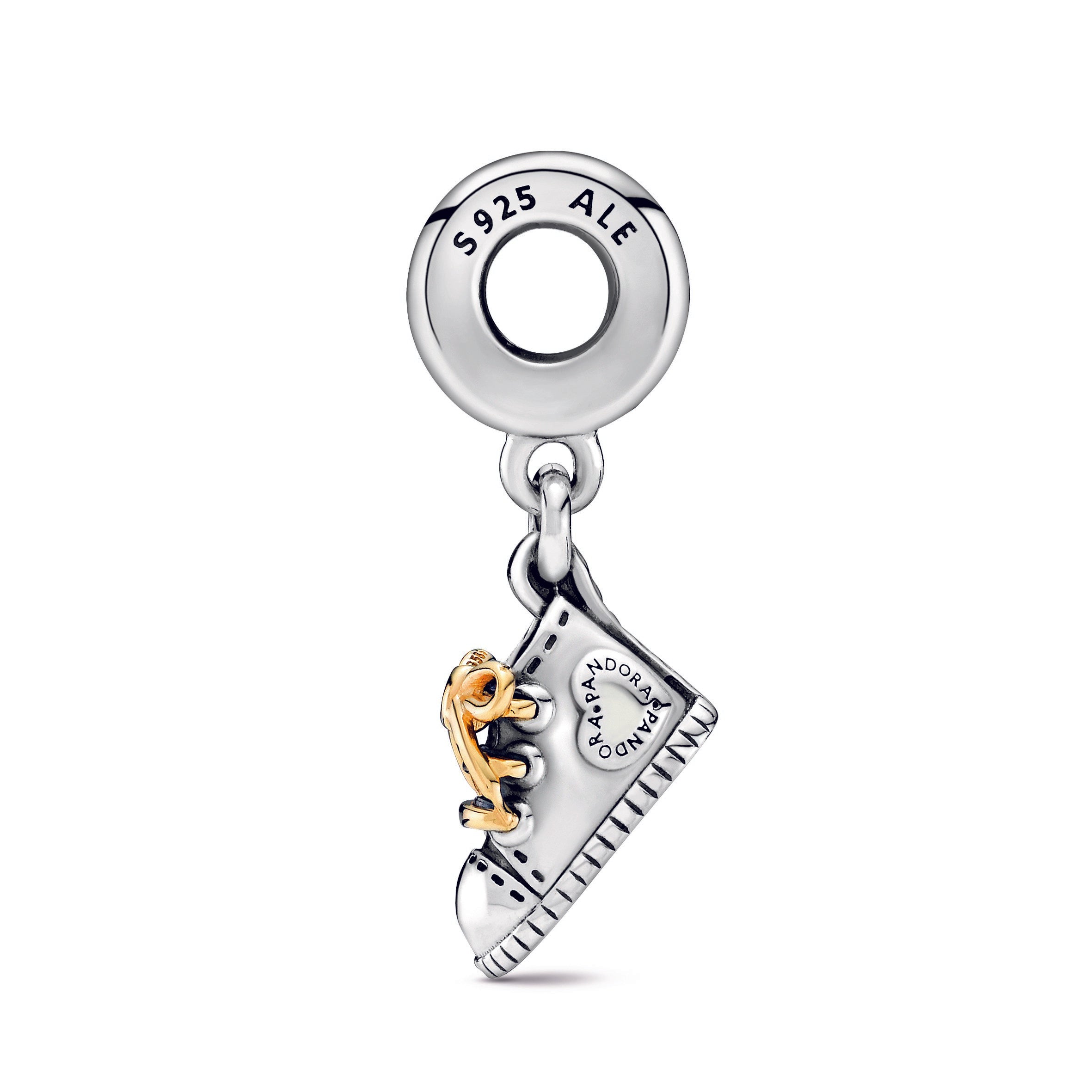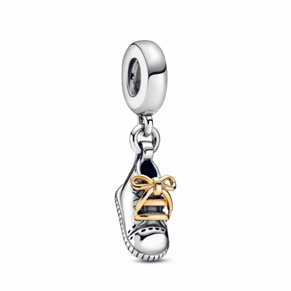 Welcome a new little one into the world with the Baby Shoe Dangle Charm. Shaped into a small shoe, this two-tone piece is hand-finished in sterling silver with 14k gold laces. Hollow on the inside, this baby charm includes stitching details for extra decoration. A lifted heart featuring the Pandora logo on the side gives this dangle charm an iconic finish. Spread the joy with this Pandora Moments silver charm.