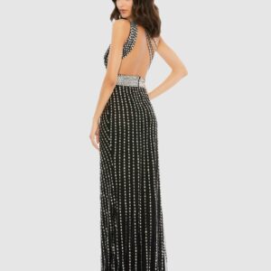 One-shoulder column gown detailed with rows of rhinestones, bejeweled waistline, and a thigh-high slit. Mac Duggal Beaded fabric (100% polyester) One shoulder neckline Sleeveless Thigh-high side slit Beaded-waist detailing Open back Approx. 60″ from top of shoulder to bottom hem Available in Black Style #9107
