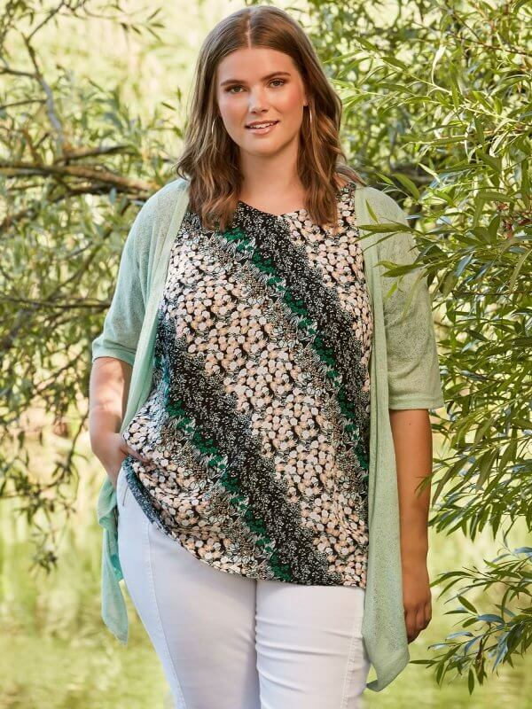 Cardigan fra Zhenzi benstende cardigan i tynd, bld strik. Falder ned i to spidser fortil. Halve rmer 84% polyester, 6% viskose Modellen er ifrt den lysegule og den sage grnne bolero p billederne.