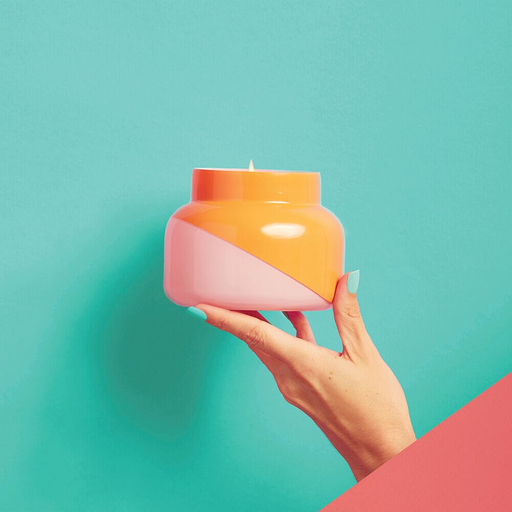 Fill your space with theVolcanofragrance in a delicious color combo! The Volcano Dual Tone Signature Jar pairs a soft, but poppy, pink and orange finish with the iconic notes of tropical fruits and sugared citrus!