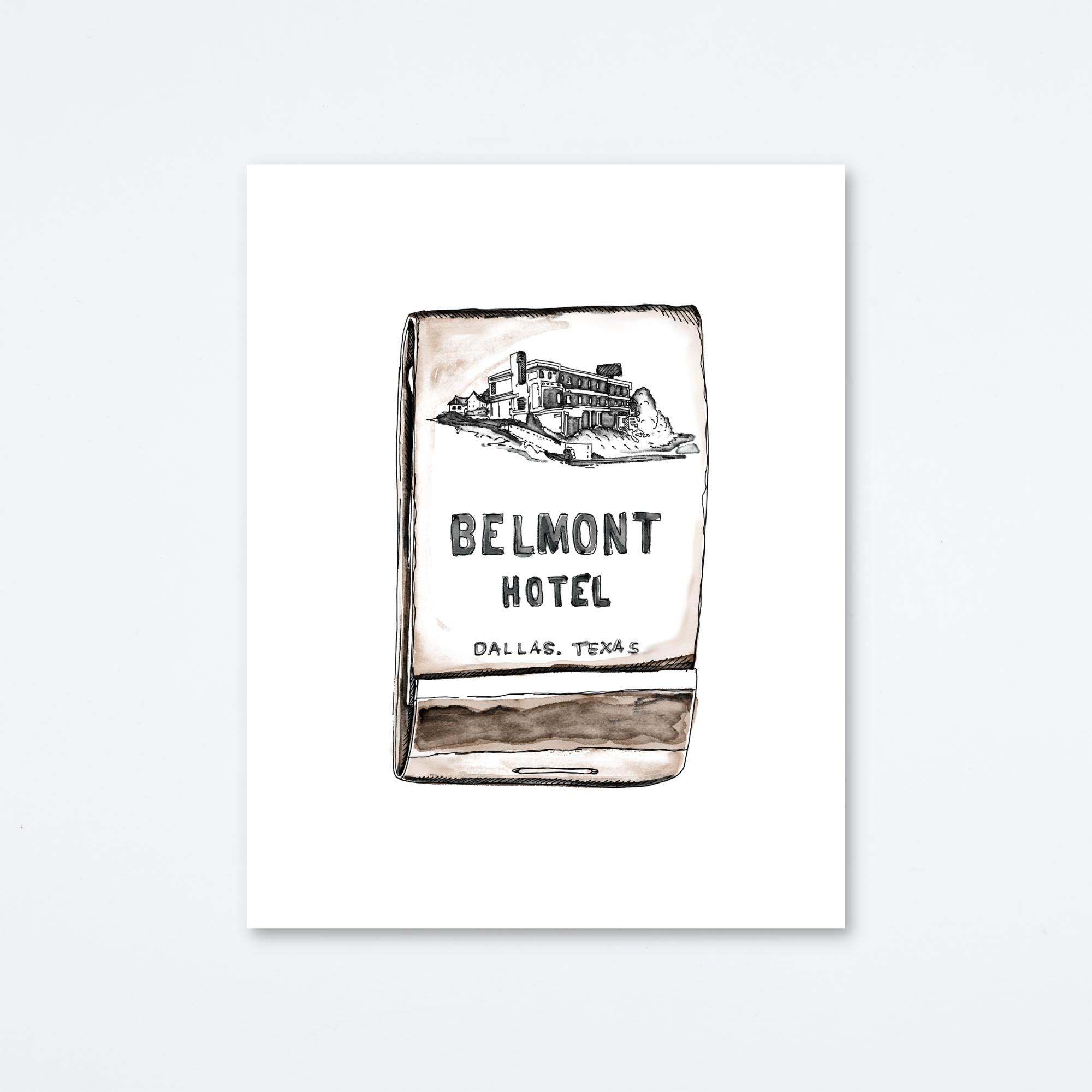 Matchbook print of original watercolor matchbook highlightingthe Belmont Hotel located in Dallas, TX