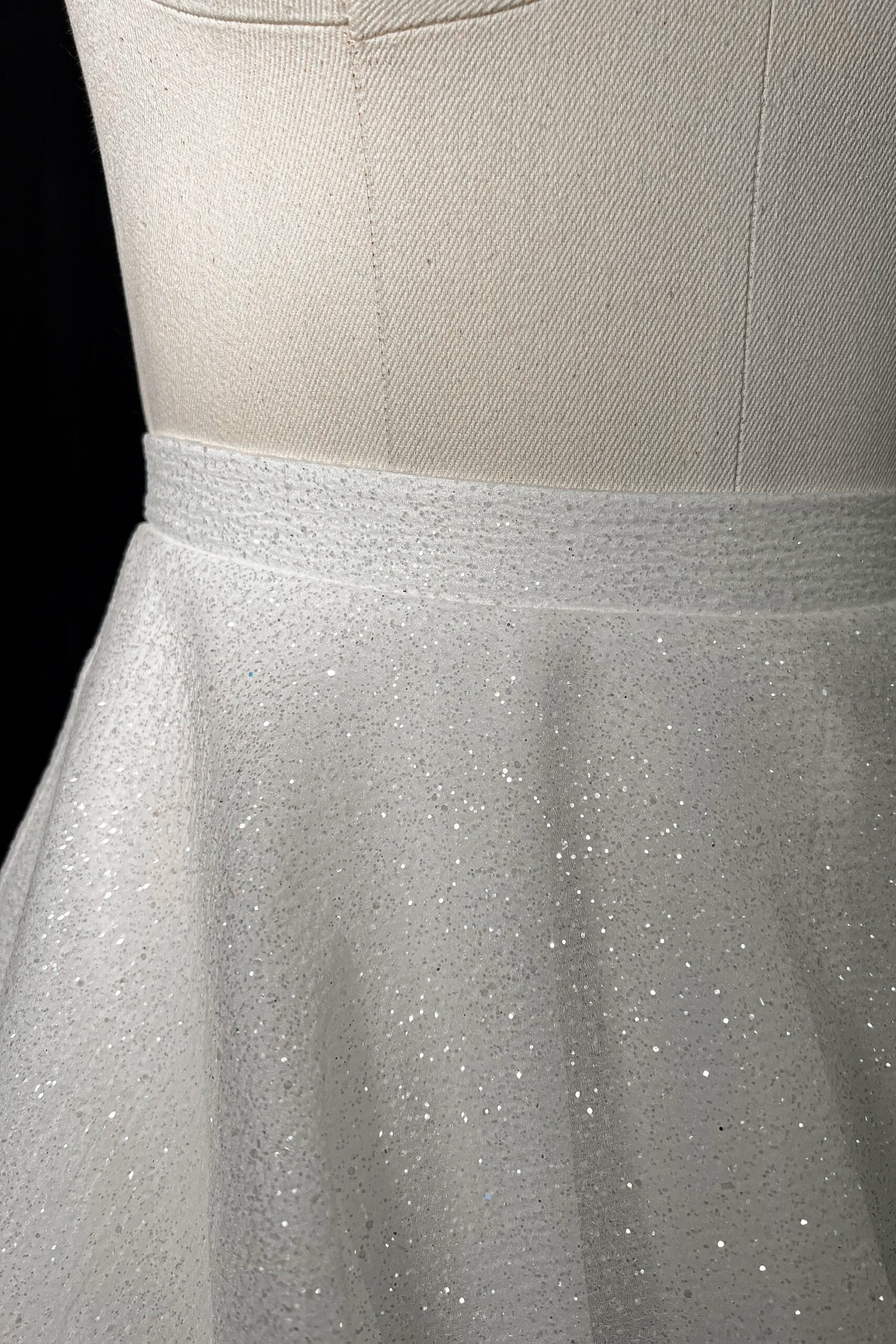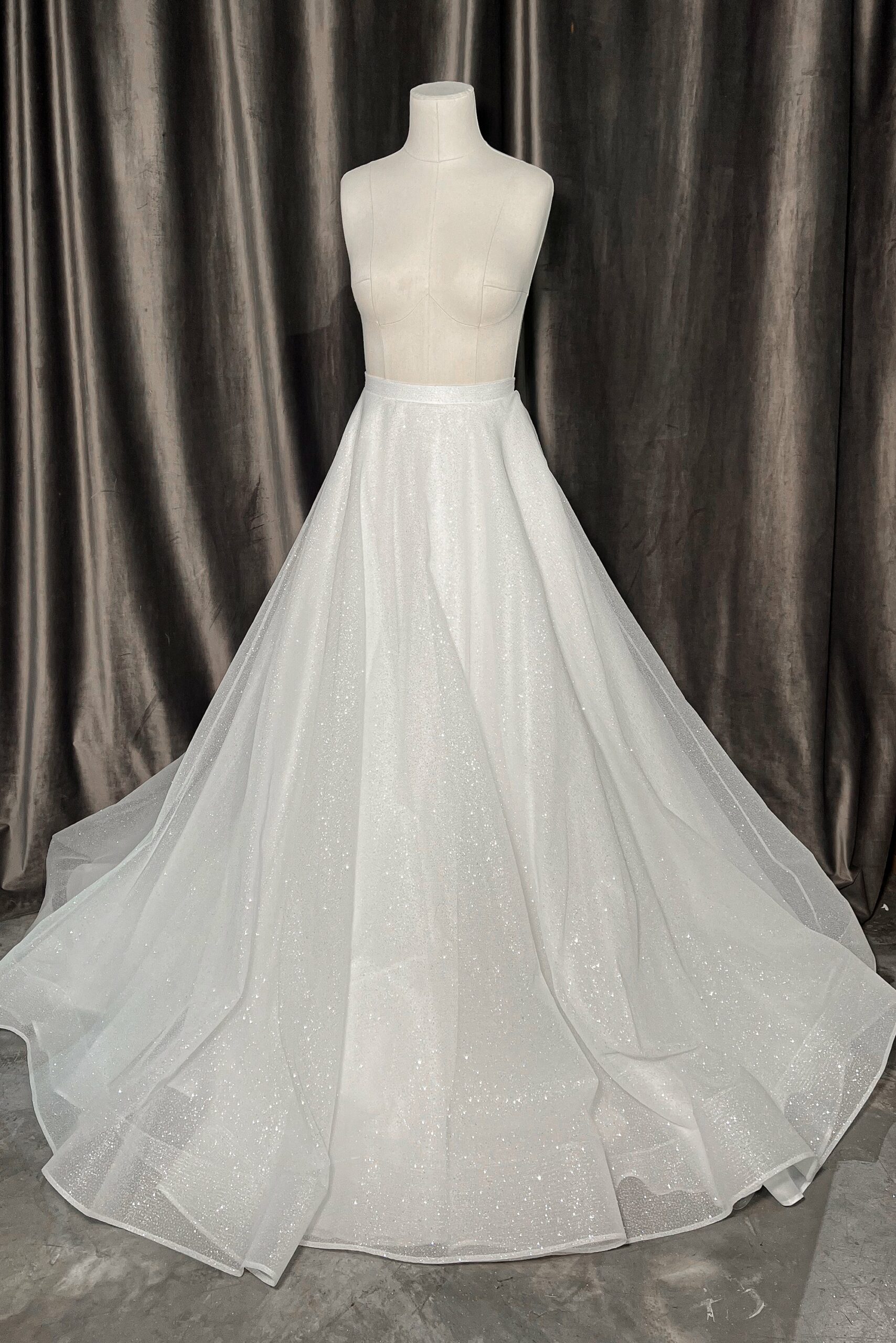 This shimmering A-line detachable skirt made with yards of glittery tulle, it’s perfect for brides seeking comfort and a show-stopping look.