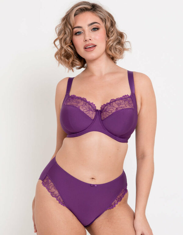 Flirtelle’s Emilie full cup bra offers reliable fit, support and comfort up to a K cup. Now available in a bold purple hue, this fuller coverage bra ensures your bust is secure day to day. Non-padded, 4-part cups use a side panel to give forward projection, with a sturdy mesh lining to maintain shape and support. The soft microfibre outer fabric gives a smooth, soft feel, while the top cup boasts floral embroidery detail for a pretty, feminine finish. Side support gives great forward projection Non-padded Underwired Fully adjustable, 22mm wide straps 2-hook fastening for sizes 32-36 F cups; all other sizes have 3-hooks Embroidery: 100% Polyester, Main: 87% Polyester, 13% Elastane, Lining: 100% Polyamide, Wing Mesh: 73% Polyamide, 27% Elastane