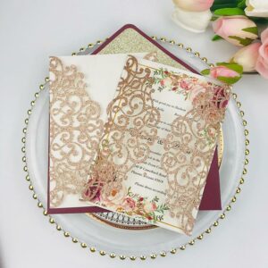 Modern Rose Gold Laser Cut Wedding Invitations with Floral Details Lcz033 Being simple is actually being elegant. This rose gold glittery invitation card is so charming that it’s perfect for weddings, bridal showers and Quinceaera.