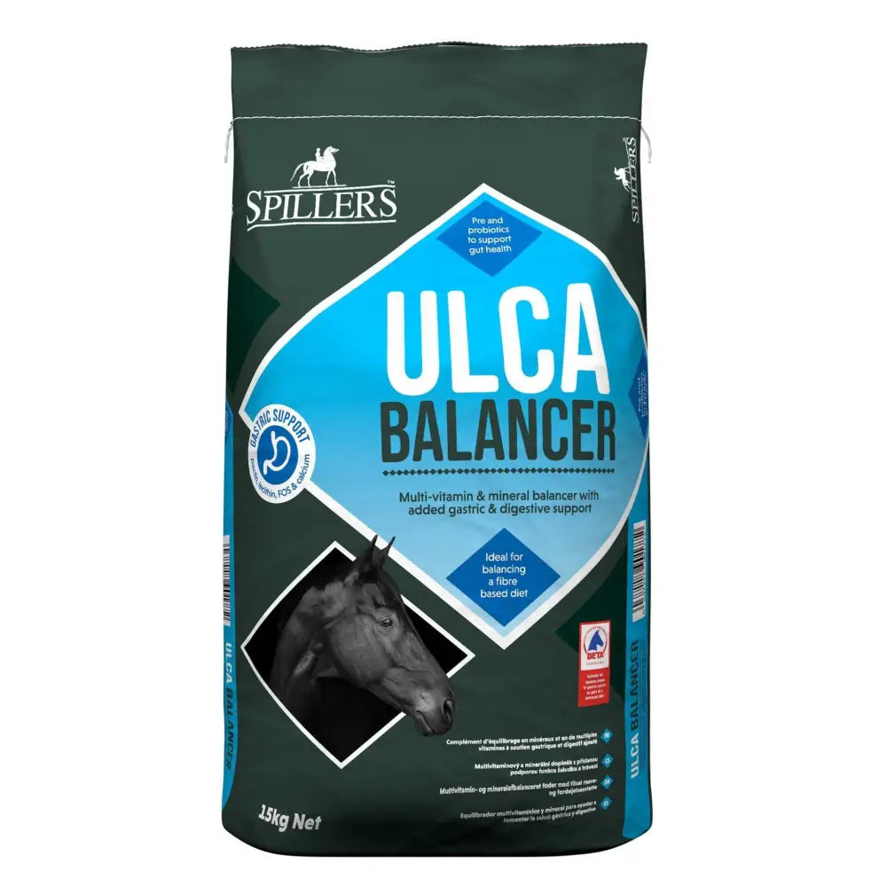 Spillers Ulca Balancer Multi-vitamin & mineral balancer for horses and ponies prone to gastric ulcers; ideal for those that maintain weight easily on forage alone. Includes apple pectin and lecithin to help support the stomach lining. Contains a natural source of calcium and FOS to help maintain a healthy pH in the stomach. Formulated with probiotic live yeast alongside prebiotic MOS & FOS to support digestive health. Whole cereal grain free, low in starch and sugar. Contains 15mg of biotin per 500g serving proven to support hoof health. Ingredients Soya (bean) meal (GM) Wheatfeed Sunflower seed meal dehulled Rice bran Maerl (Acid Buf (3%)) Molasses Oligo-fructose (2%) Rapeseed oil Yeast products (1%) Di calcium phosphate Salt Calcium carbonate Magnesium oxide Lecithin Apple pectin (0.35%) Please note that we may occasionally make small adjustments to our formulations. Please contact Care-Line for specific advice, especially in relation to allergies. 20Kg Bags