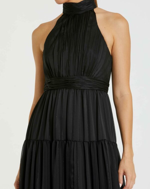 High neck halter gown features a pleated bodice, belted waist, and a tiered floor-length skirt. Mac Duggal Chiffon fabric (100% polyester) Fully lined Halter neckline Sleeveless Tiered skirt Approx. 64″ from top of shoulder to bottom hem Available in Black, Slate Blue, and Burgundy Style #49515