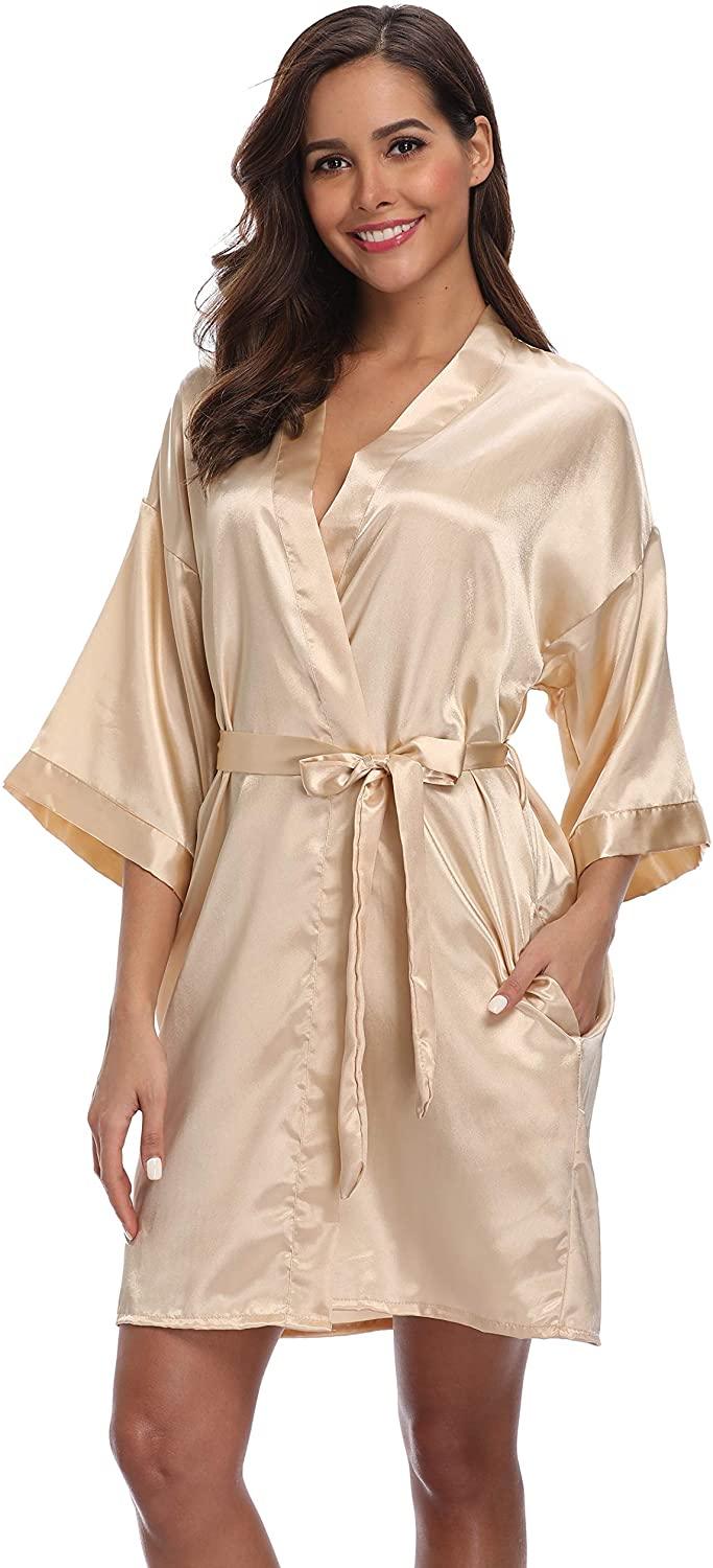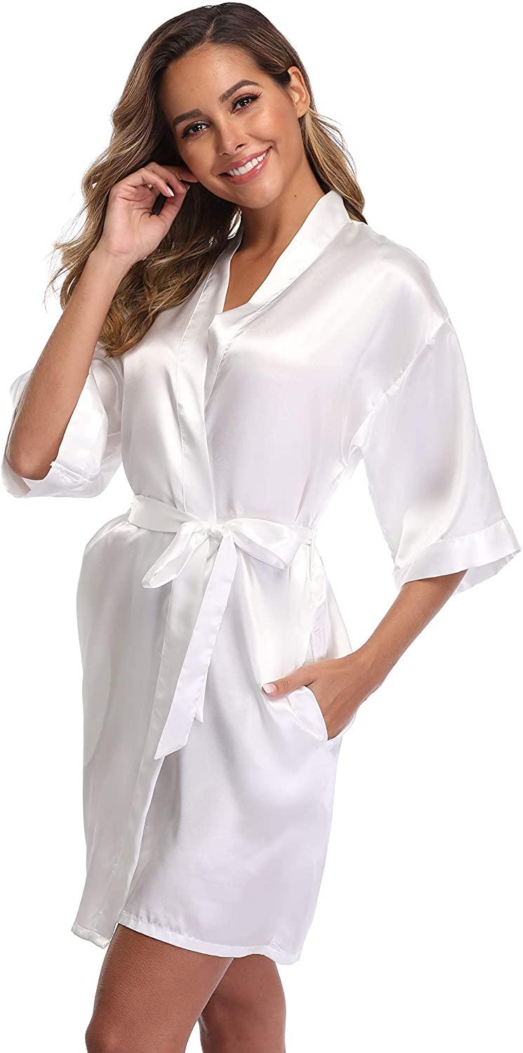 100% Polyester Tie closure 100% Polyester Classic Oblique V Neck Kimono Robe, Solid color USEFUL DETAIL: Two on seam pockets, inner string tie and sash tie Lightweight Robe; 3/4-Length Sleeves; Mid-Thigh Length A perfect addition to your lingerie wardrobe. Also a great as a getting ready robe for bride, bridesmaids